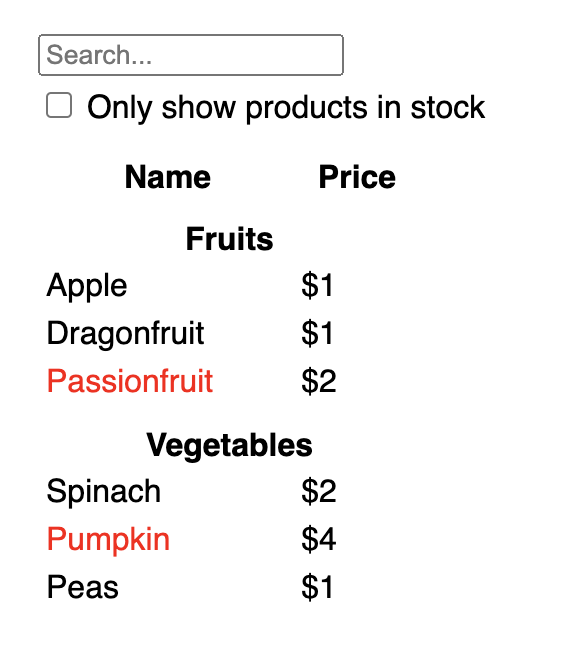 function ProductCategoryRow({ category }) { return ( <tr> <th colSpan="2"> {category} </th> </tr> ); } function ProductRow({ product }) { const name = product.stocked ? product.name : <span style={{ color: 'red' }}> {product.name} </span>; return ( <tr> <td>{name}</td> <td>{product.price}</td> </tr> ); } function ProductTable({ products }) { const rows = []; let lastCategory = null; products.forEach((product) => { if (product.category !== lastCategory) { rows.push( <ProductCategoryRow category={product.category} key={product.category} /> ); } rows.push( <ProductRow product={product} key={product.name} /> ); lastCategory = product.category; }); return ( <table> <thead> <tr> <th>Назва</th> <th>Цана</th> </tr> </thead> <tbody>{rows}</tbody> </table> ); } function SearchBar() { return ( <form> <input type="text" placeholder="Шукаць..." /> <label> <input type="checkbox" /> {' '} Паказваць толькі тавары ў наяўнасці </label> </form> ); } function FilterableProductTable({ products }) { return ( <div> <SearchBar /> <ProductTable products={products} /> </div> ); } const PRODUCTS = [ {category: "Fruits", price: "$1", stocked: true, name: "Яблык"}, {category: "Fruits", price: "$1", stocked: true, name: "Пітайя"}, {category: "Fruits", price: "$2", stocked: false, name: "Маракуйя"}, {category: "Vegetables", price: "$2", stocked: true, name: "Шпінат"}, {category: "Vegetables", price: "$4", stocked: false, name: "Гарбуз"}, {category: "Vegetables", price: "$1", stocked: true, name: "Гарох"} ]; export default function App() { return <FilterableProductTable products={PRODUCTS} />; }